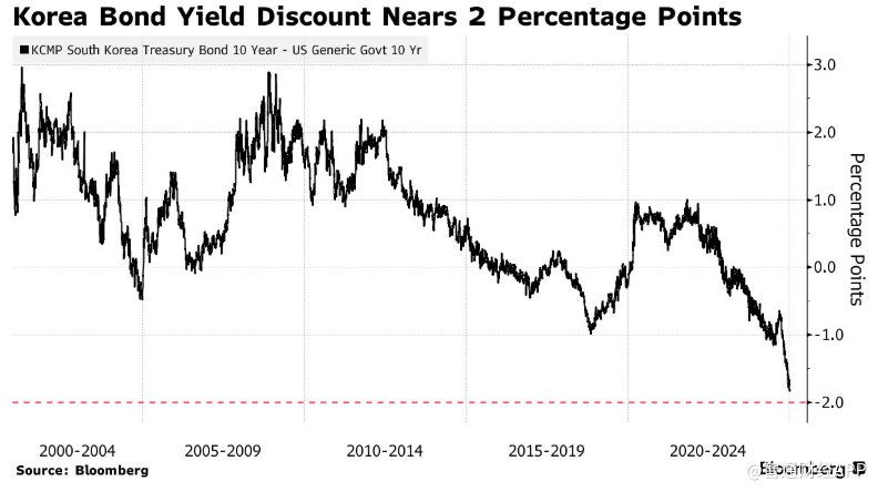 韩国国债相对于美国国债的收益率已连续跌至历史低点,给已经受到政治危机打击的韩元带来进一步压力。韩国10年期国债与美国10年期国债的收益率之差本周扩大至约190个基点,一些分析师认为,考虑到潜在的动态,利差将超过200个基点。自去年年中以来,由于经济不景气,韩国债券收益率一直在下滑,在去年11月韩国央行意外降息后,收益率下降速度加快。