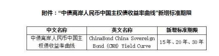 为进一步满足境内外投资者对于离岸人民币债券价格指标产品的需求,全面反映离岸人民币主权债市场情况,我们拟于2025年3月31日增加中债离岸人民币中国主权债收益率曲线的15年、20年和30年标准期限,新增标准期限详见附件。